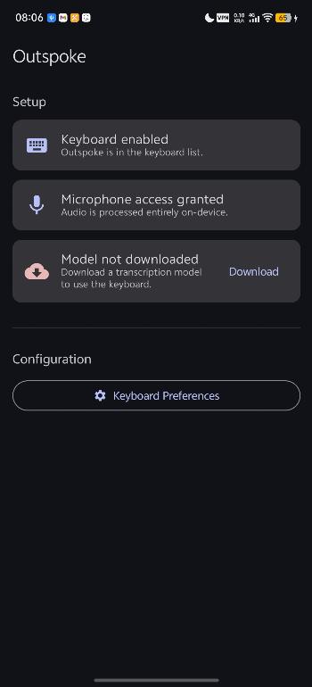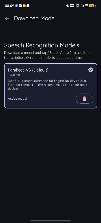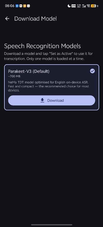 All transcription happens entirely on your device using the NVIDIA Parakeet ASR model via ONNX Runtime - no audio ever leaves your phone, no account required, and no internet connection is needed after the model is downloaded.